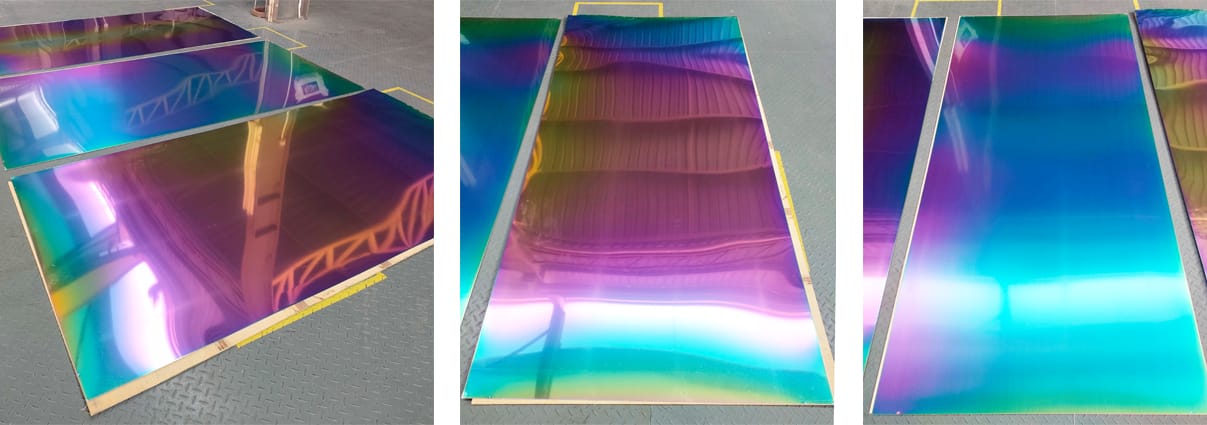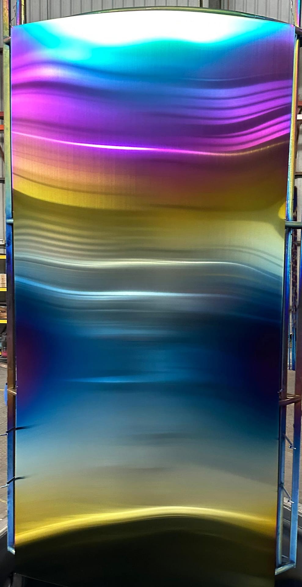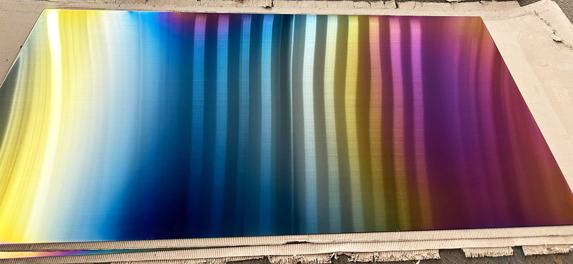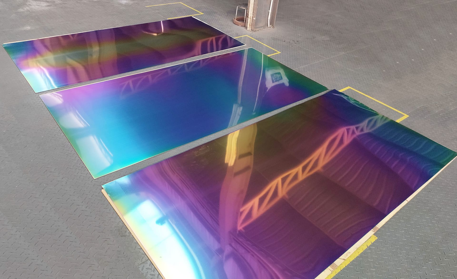 Rainbow color on stainless steel surface (plate) applied by technology of Physical Vapor Deposition (PVD). This surface treatment is suitable for interior equipment and decoration for hotels, villas, shopping mall and etc. If you interested to decorate your product with colorful and unique looks, please don’t hesitate to contact us for #pvdcoating works. For more details and information, please contact us.