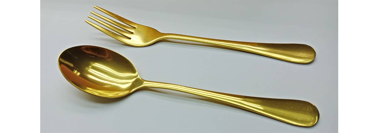PVD Hard Coating (TiN) on spoon and fork will bring luxury to any dining table. Our gold coatings can increase the durability and wear resistance of utensils. For more details and information, please contact us.